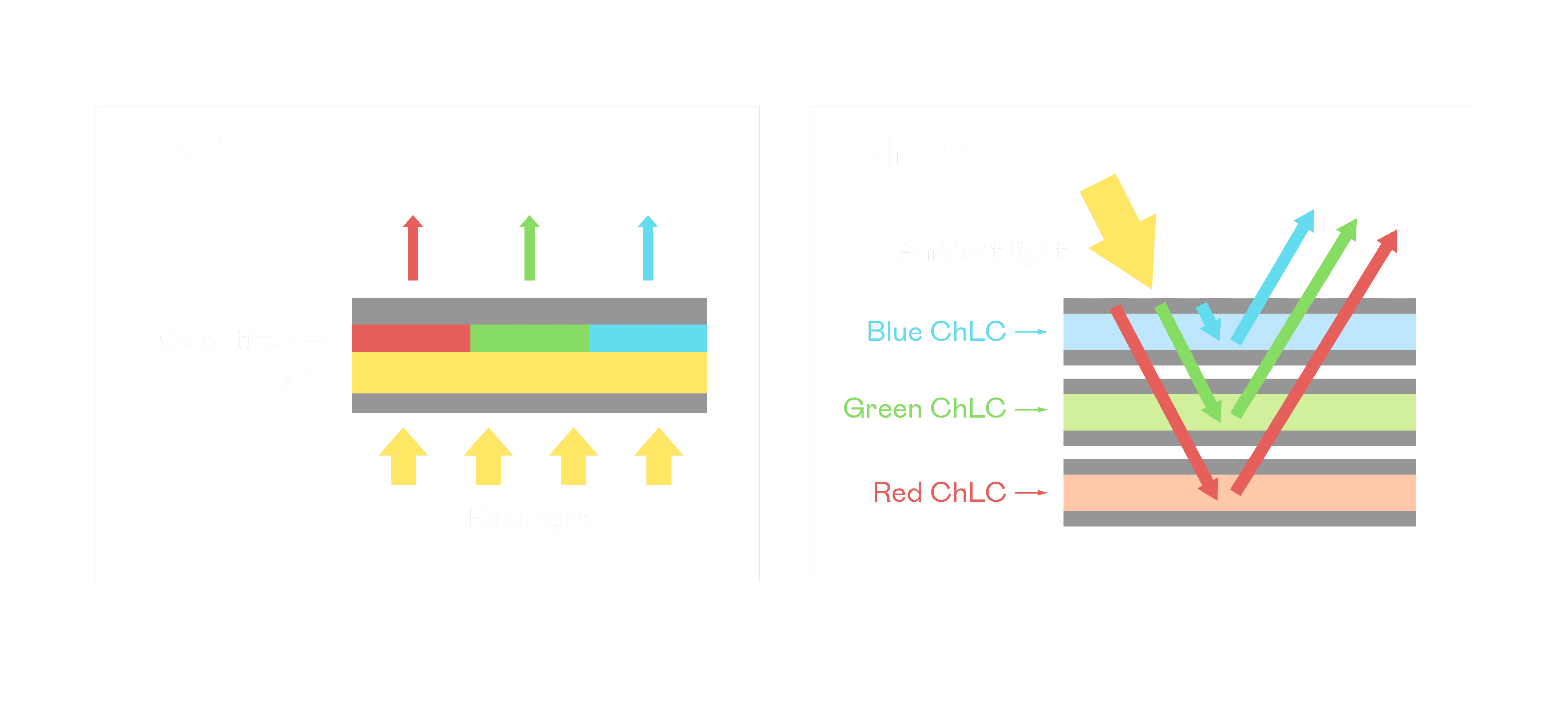 ChLCD 胆固醇液晶就如同纸张一样,,,透过反射环境光来显示影像,,因此长时间观看不易造成人眼视觉疲劳,,,,可达到护眼效果。。当处于户外阳光下使用,,,LCD 影像容易失真而不易观看,,,,但胆固醇液晶仍可维持较佳的影像品质。。。