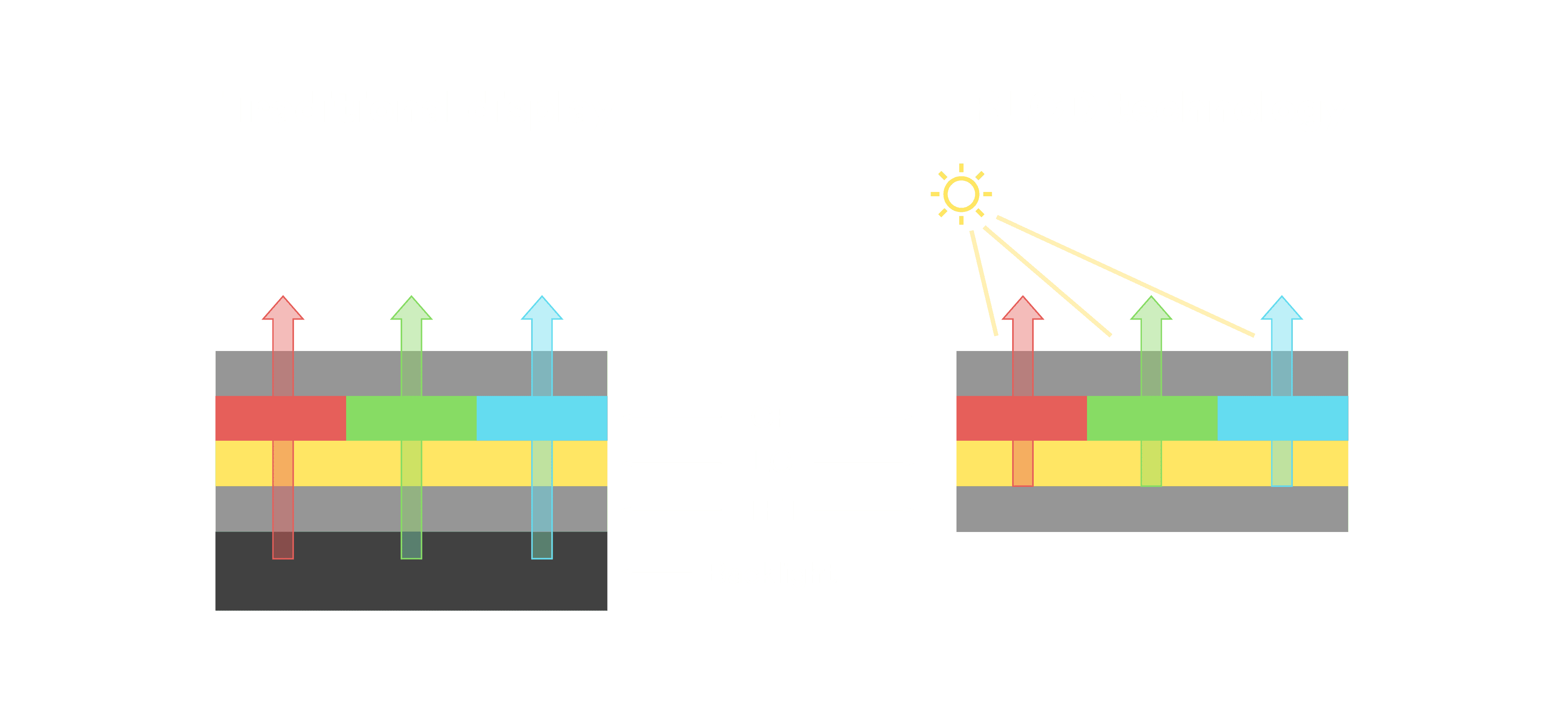 与传统需搭配背光单元的液晶显示相比,,反射式液晶技术不仅更省电、、、更轻薄,,,,且即便在艳阳下仍能清晰显示。。。。此外,,,少了背光单元,,也大幅降低了 LED 蓝光伤害眼睛的疑虑。。