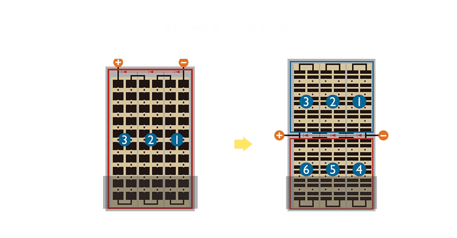 优化的太阳能电池结构设计,,,,不仅提高电流收集效率,,,,降低电池隐裂,,,使太阳能模组长期维持稳定的输出效能,,,,提高营运效益。。